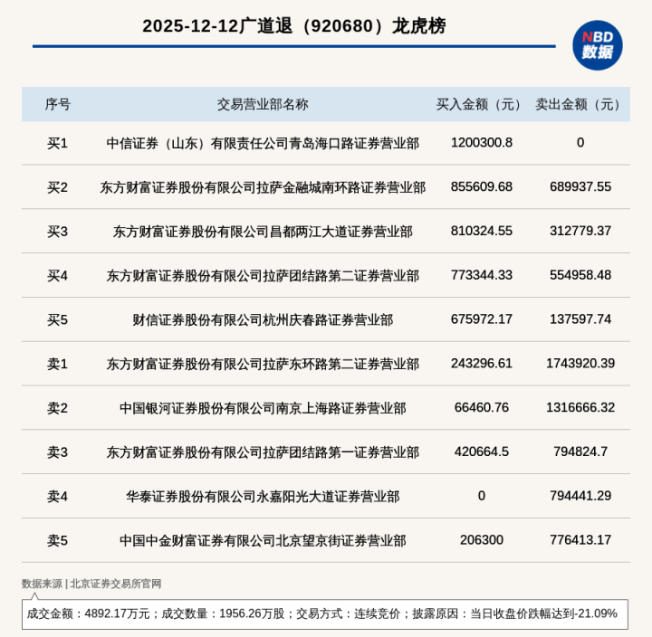 每经讯,2025年12月12日,北交所上市公司广道退(920680,收盘价:2.17元)登上龙虎榜,交易方式是连续竞价,披露原因是当日收盘价跌幅达到-21.09%,成交数量1956.26万股,成交金额4892.17万元。买一席位为中信证券(山东)有限责任公司青岛海口路证券营业部,买入120.03万元;卖一席位为东方财富证券股份有限公司拉萨东环路第二证券营业部,卖出174.39万元。