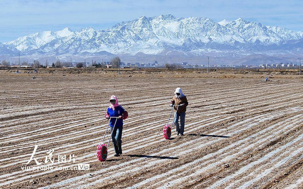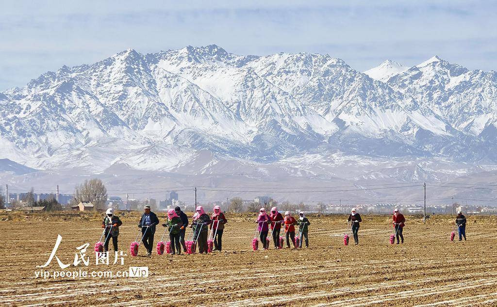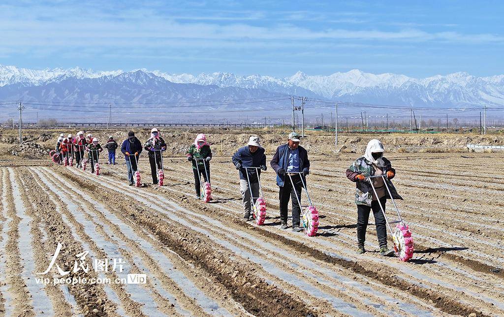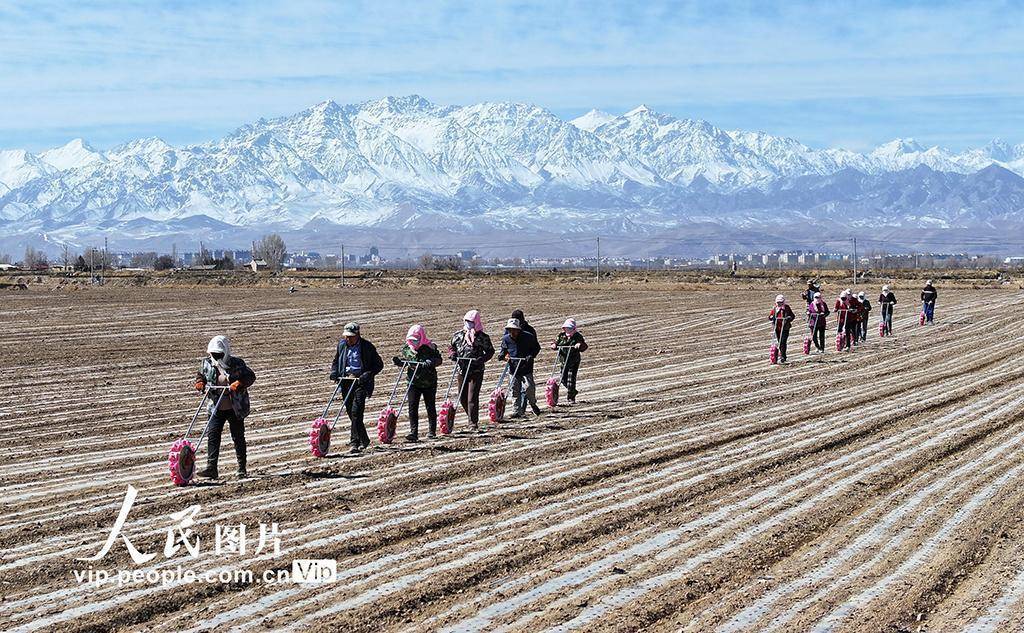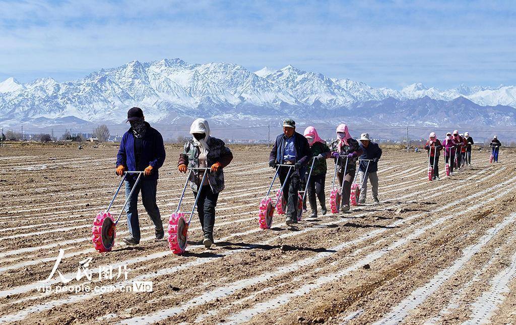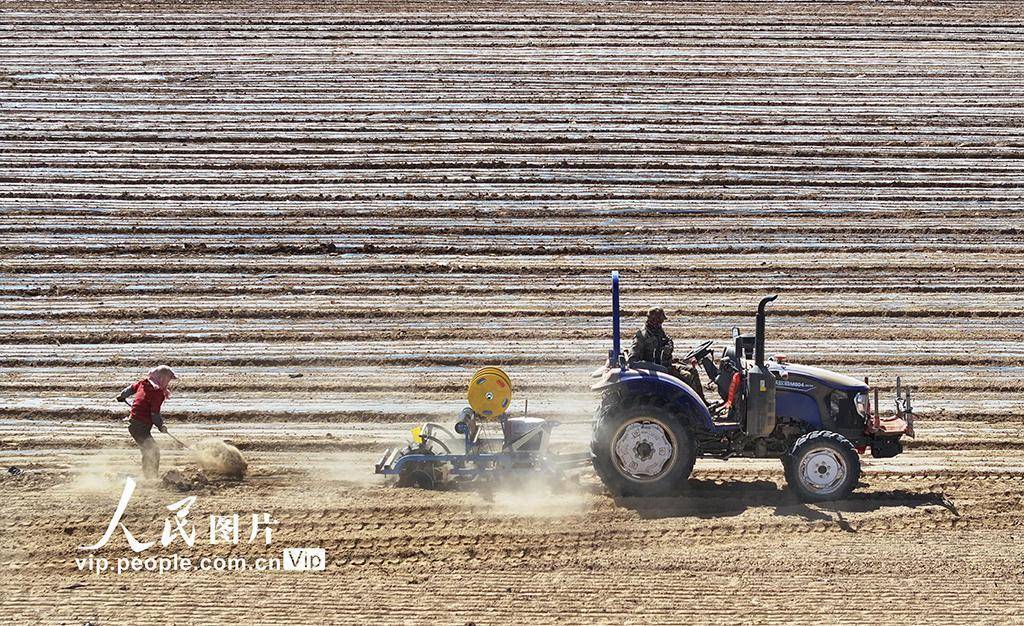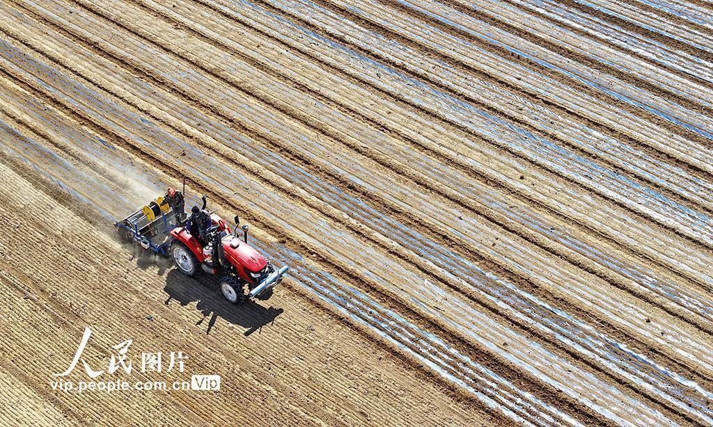 2026年3月31日,在甘肃张掖民乐县民联镇的千亩茴香种植基地,拖拉机正牵引滴灌覆膜一体机在田间往复作业,村民们使用点播器播种茴香。